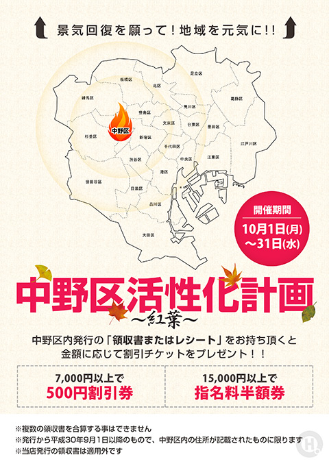 中野区内発行の「領収書またはレシート」をお持ち頂くと金額に応じて割引チケットをプレゼント!!