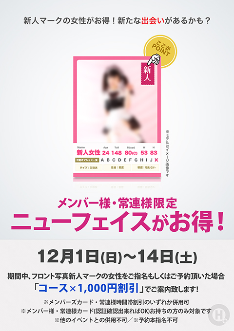 期間中、フロント写真新人マークの女性をご指名もしくはご予約頂いた場合「コース×1,000円割引」でご案内致します!