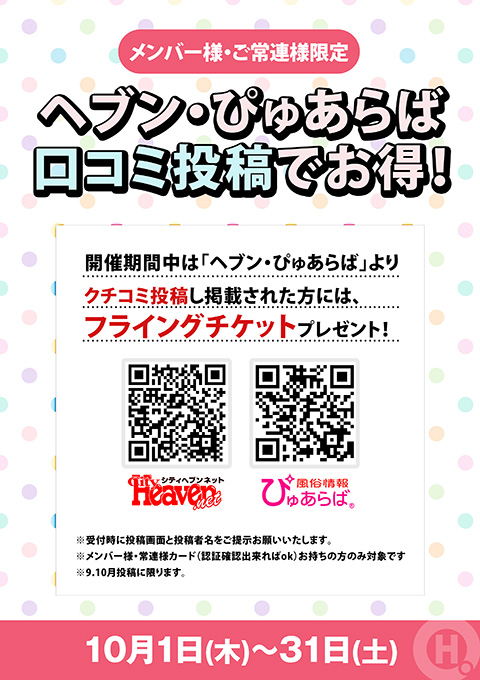 メンバー様・ご常連様限定/ヘブン・ぴゅあらば口コミ投稿でお得!
