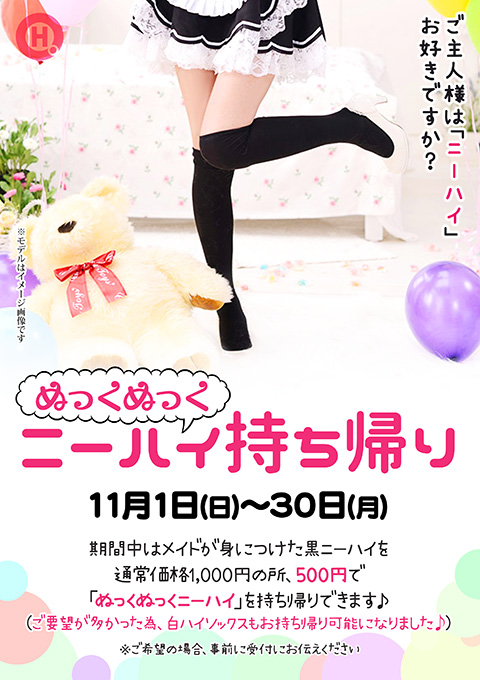 期間中はメイドが身につけた黒ニーハイを通常価格1,000円の所、500円で「ぬっくぬっくニーハイ」を持ち帰りできます♪