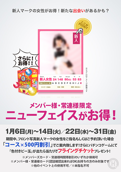 期間中、フロント写真新人マークの女性をご指名もしくはご予約頂いた場合「コース×500円割引」でご案内致します!