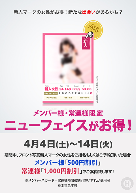 期間中、フロント写真新人マークの女性をご指名もしくはご予約頂いた場合