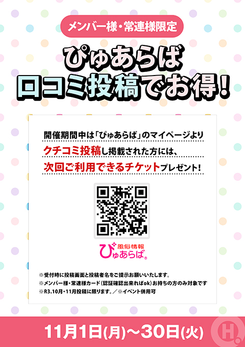 メンバー様・常連様限定/ぴゅあらば口コミ投稿でお得!