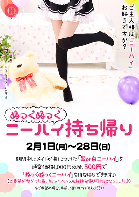 期間中はメイドが身につけた「黒or白ニーハイ」を通常価格1,000円の所、500円で「ぬっくぬっくニーハイ」を持ち帰りできます♪