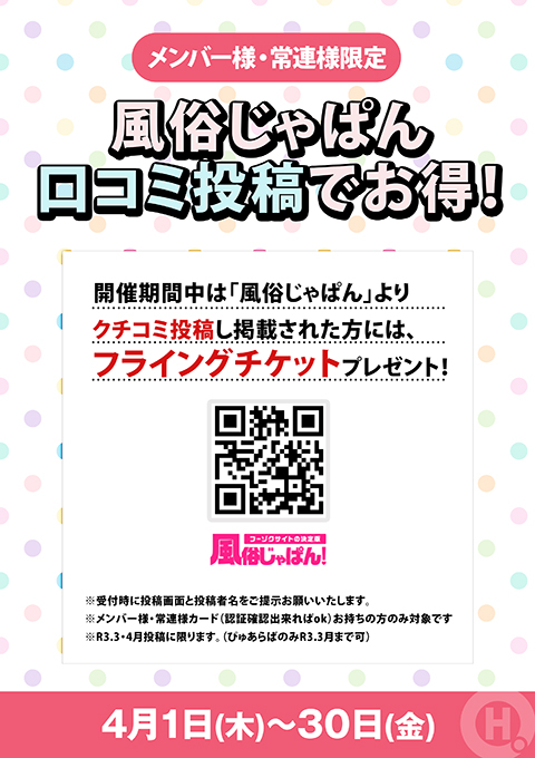 開催期間中は「風俗じゃぱん」よりクチコミ投稿し掲載された方には、フライングチケットプレゼント!