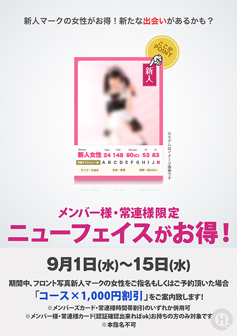 期間中、フロント写真新人マークの女性をご指名もしくはご予約頂いた場合「コース×1,000円割引」をご案内致します!