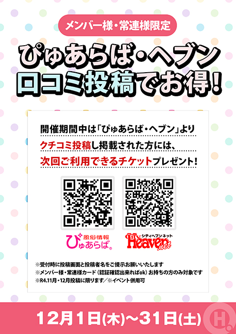 メンバー様・常連様限定/ぴゅあらば・ヘブン口コミ投稿でお得!