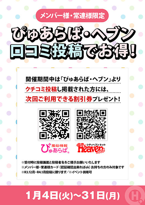 メンバー様・常連様限定/ぴゅあらば・ヘブン口コミ投稿でお得!