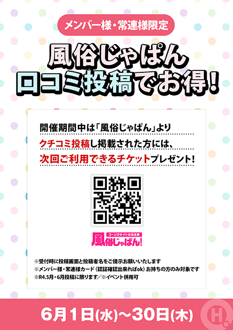 開催期間中は「風俗じゃぱん」よりクチコミ投稿し掲載された方には、次回ご利用できるチケットプレゼント!