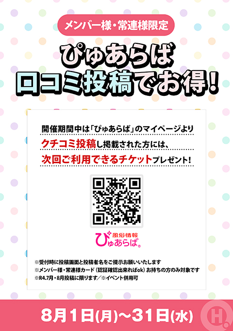 メンバー様・常連様限定/ぴゅあらば口コミ投稿でお得!