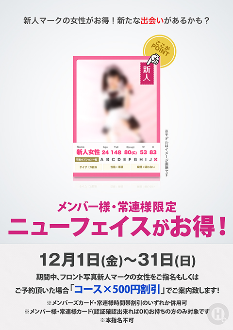 期間中、フロント写真新人マークの女性をご指名もしくはご予約頂いた場合「コース×500円割引」でご案内致します!