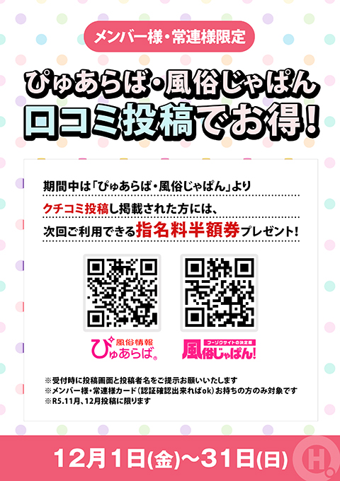 開催期間中は「ぴゅあらば・風俗じゃぱん」よりクチコミ投稿し掲載された方には、次回ご利用できる指名料半額券プレゼント!