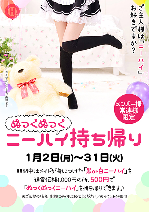 期間中はメイドが身につけた「黒or白ニーハイ」を通常価格1,000円の所、500円で「ぬっくぬっくニーハイ」を持ち帰りできます♪