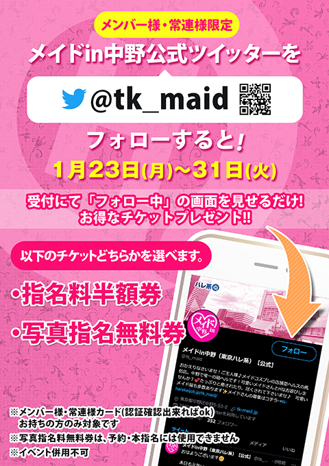 メンバー様・常連様限定/メイドin中野公式ツイッターをフォローすると!