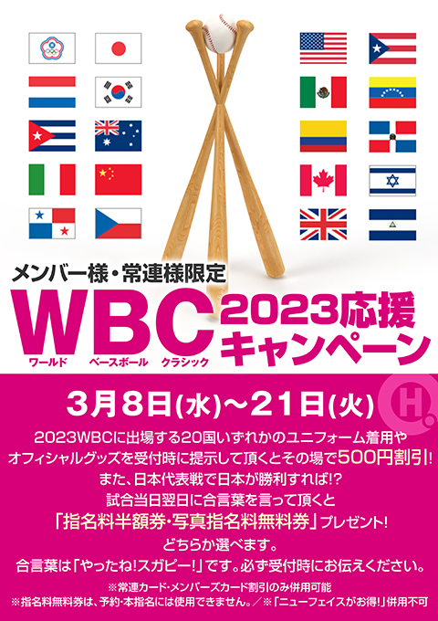 2023WBCに出場する20国いずれかのユニフォーム着用やオフィシャルグッズを受付時に提示して頂くとその場で500円割引!