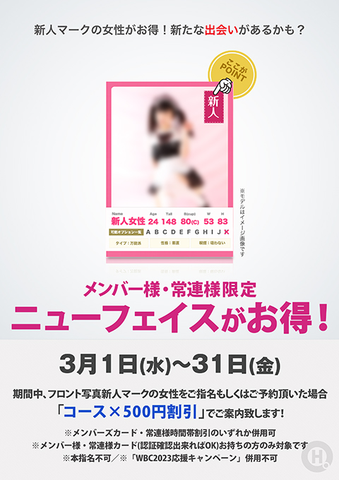 期間中、フロント写真新人マークの女性をご指名もしくはご予約頂いた場合「コース×500円割引」でご案内致します!
