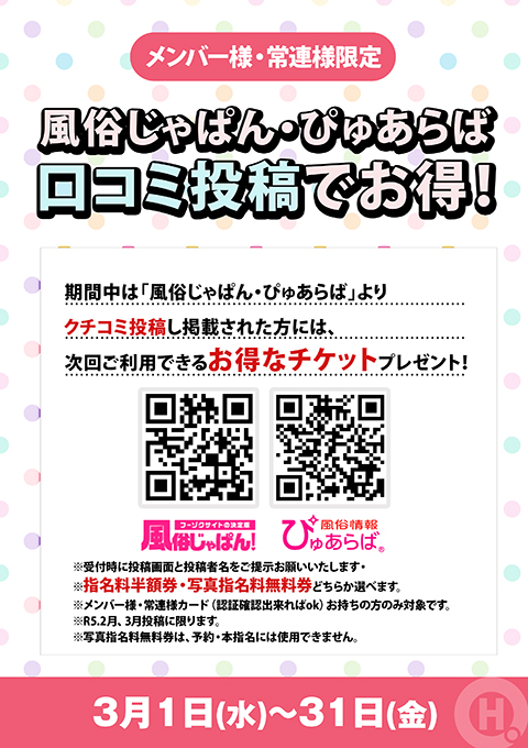 期間中は「風俗じゃぱん・ぴゅあらば」よりクチコミ投稿し掲載された方には、次回ご利用できるお得なチケットプレゼント!