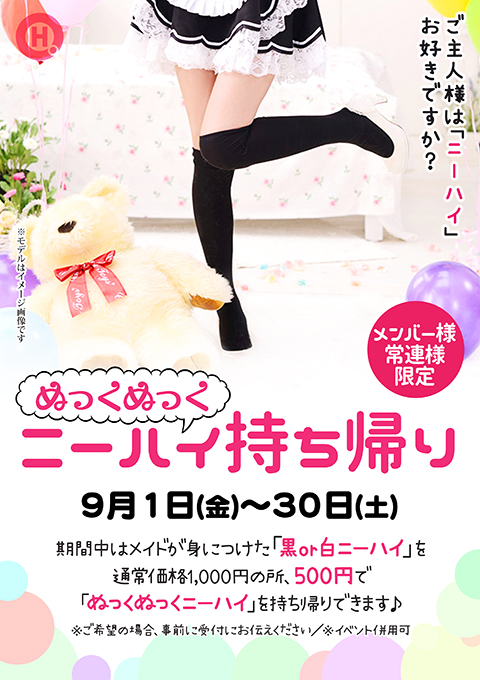 期間中はメイドが身につけた「黒or白ニーハイ」を通常価格1,000円の所、500円で「ぬっくぬっくニーハイ」を持ち帰りできます♪