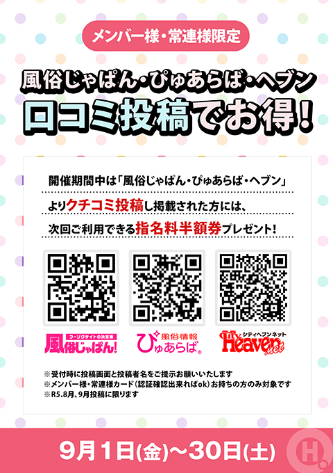 開催期間中は「風俗じゃぱん・ぴゅあらば・ヘブン」よりクチコミ投稿し掲載された方には、次回ご利用できる指名料半額券プレゼント!