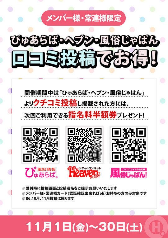 開催期間中は「ぴゅあらば・ヘブン・風俗じゃぱん」よりクチコミ投稿し掲載された方には、次回ご利用できる指名料半額券プレゼント!