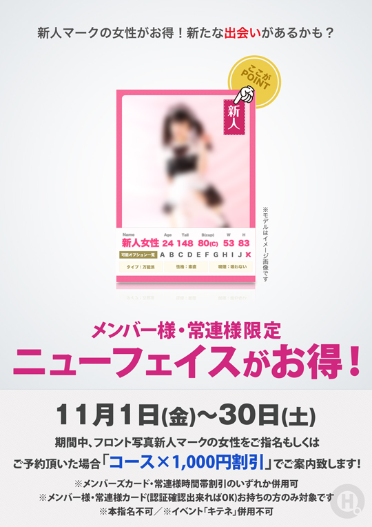 期間中、フロント写真新人マークの女性をご指名もしくはご予約頂いた場合「コース×1,000円割引」でご案内致します!