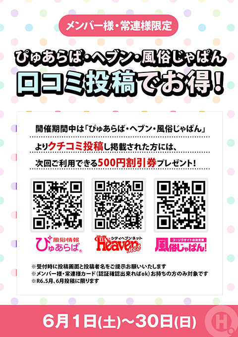 開催期間中は「ぴゅあらば・ヘブン・風俗じゃぱん」よりクチコミ投稿し掲載された方には、次回ご利用できる500円割引券プレゼント!