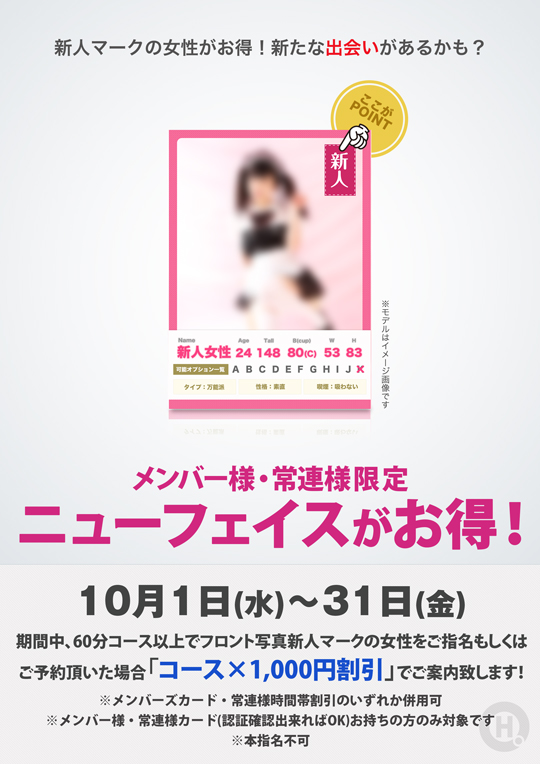 期間中、60分コース以上でフロント写真新人マークの女性をご指名もしくはご予約頂いた場合「コース×1,000円割引」でご案内致します!