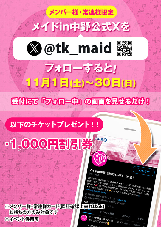 メンバー様・常連様限定/メイドin中野公式Xをフォローすると!