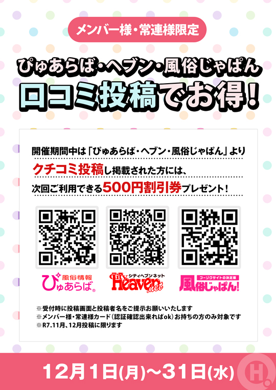 開催期間中は「ぴゅあらば・ヘブン・風俗じゃぱん」よりクチコミ投稿し掲載された方には、次回ご利用できる500円割引券プレゼント!