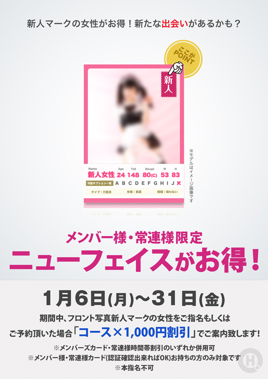 期間中、フロント写真新人マークの女性をご指名もしくはご予約頂いた場合「コース×1,000円割引」でご案内致します!