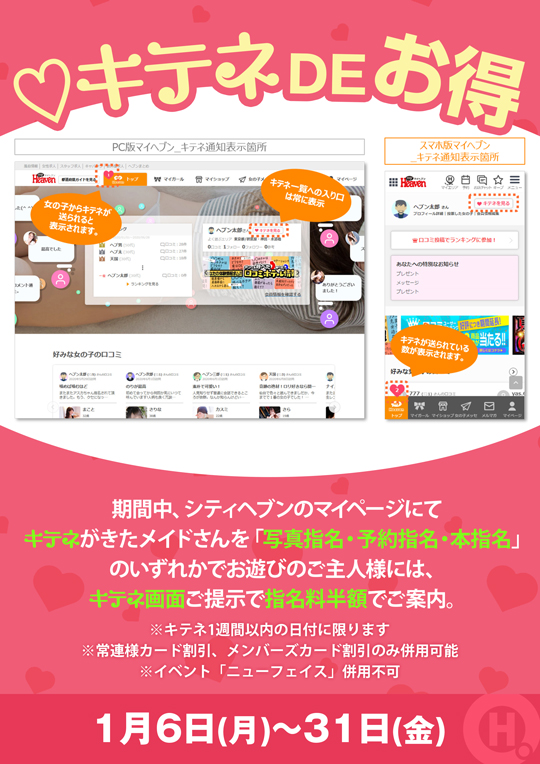 期間中、シティヘブンのマイページにてキテネがきたメイドさんを「写真指名・予約指名・本指名」のいずれかでお遊びのご主人様には、キテネ画面ご提示で指名料半額でご案内。