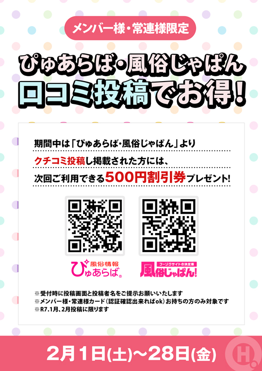 期間中は「ぴゅあらば・風俗じゃぱん」よりクチコミ投稿し掲載された方には、次回ご利用できる500円割引券プレゼント!