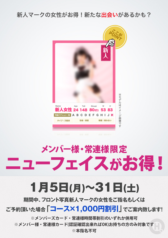 期間中、フロント写真新人マークの女性をご指名もしくはご予約頂いた場合「コース×1,000円割引」でご案内致します!