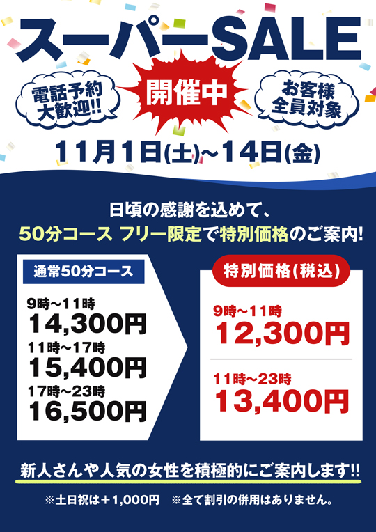 | 前日電話予約 | 前日限定(指名・フリー) PM12:30〜予約可能 |